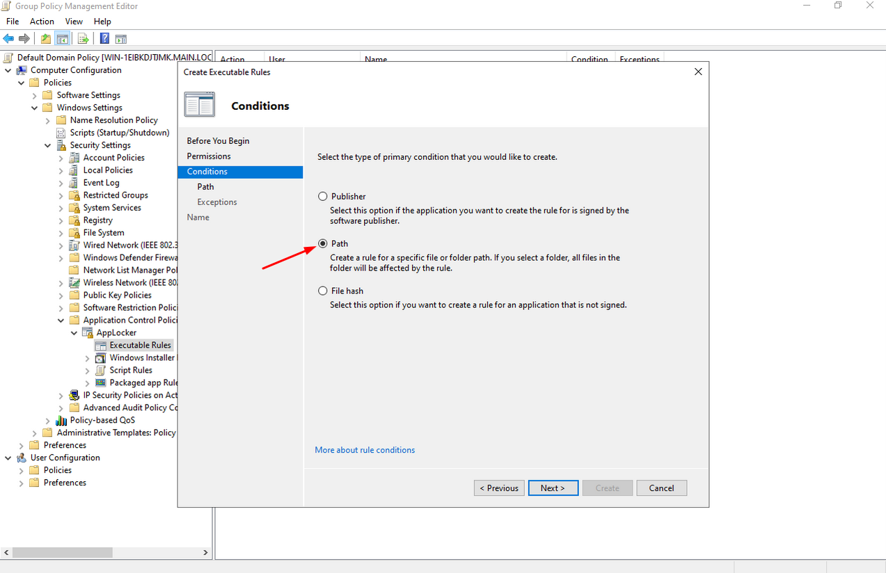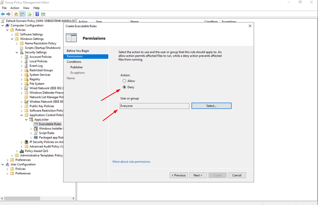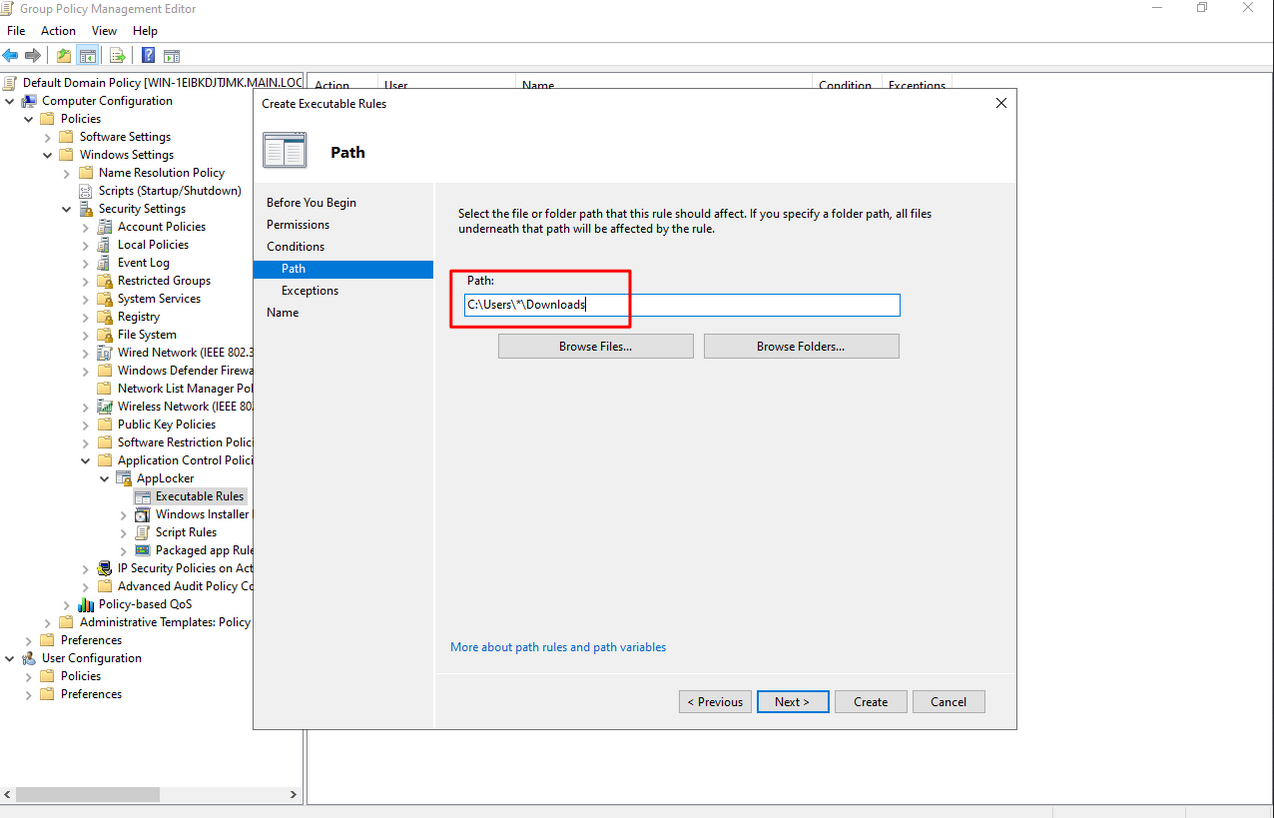Let's modify the Default Group Policy to prevent the execution of any executable files from these paths.