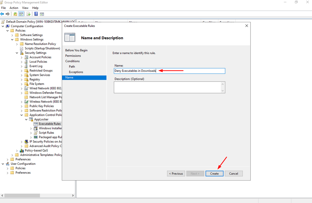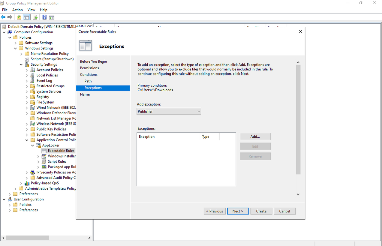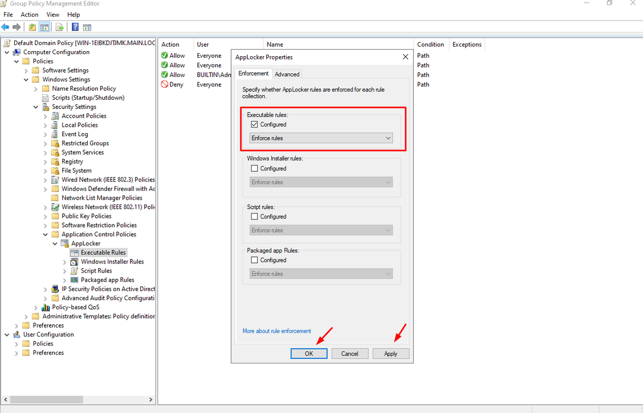 Let's modify the Default Group Policy to prevent the execution of any executable files from these paths.