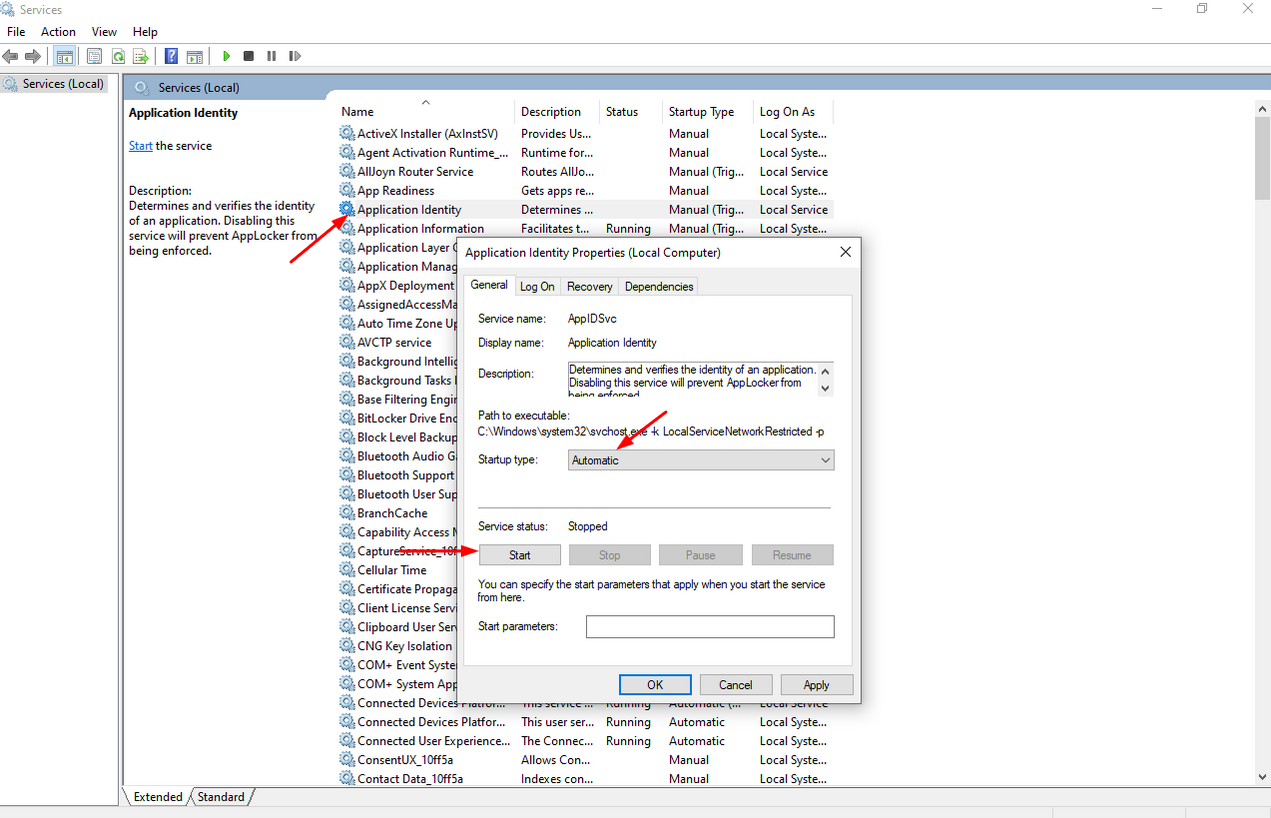 Open services.msc → Find Application Identity (AppIDSvc) → Set Startup Type to Automatic → Click Start.