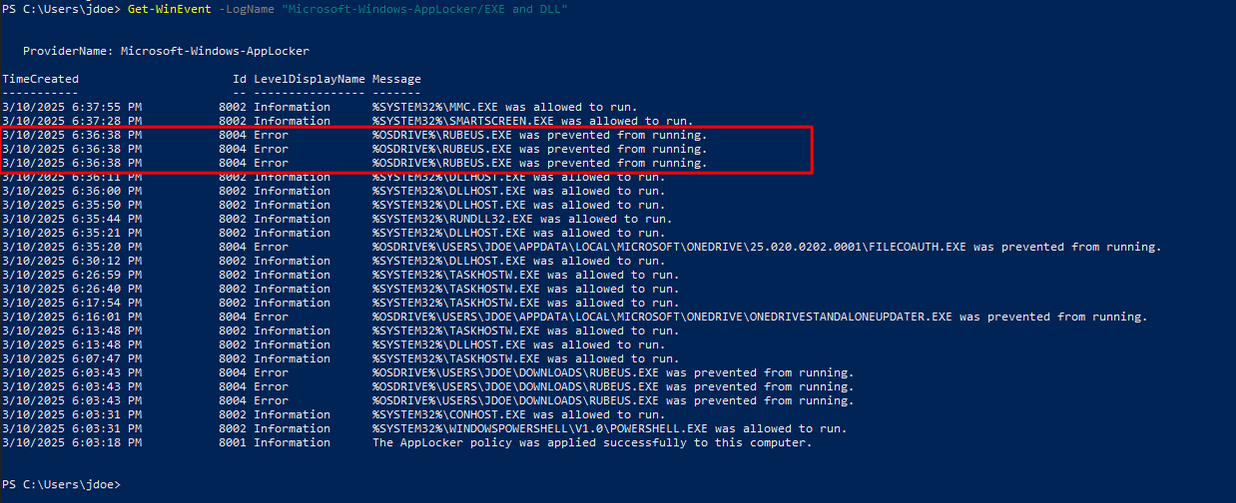 Get-WinEvent -LogName "Microsoft-Windows-AppLocker/EXE and DLL"