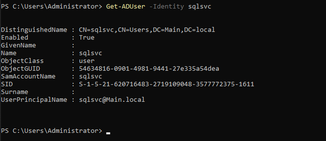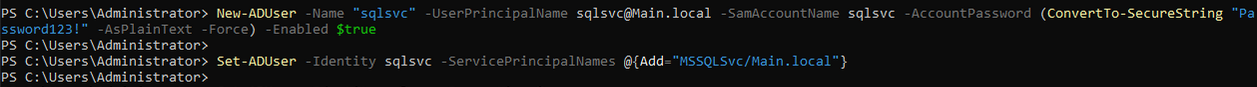 New-ADUser -Name "sqlsvc" -UserPrincipalName sqlsvc@Main.local -SamAccountName sqlsvc -AccountPassword (ConvertTo-SecureString "Password123!" -AsPlainText -Force) -Enabled $true