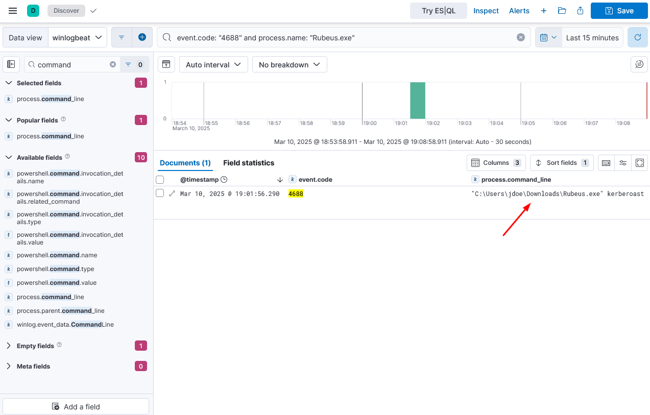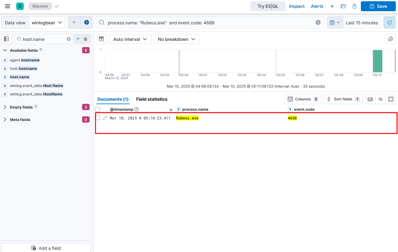 Let's execute **Rubeus.exe** again and analyze the events in **ELK**.