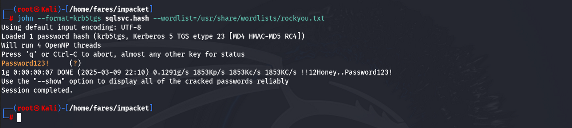 john --format=krb5tgs sqlsvc.hash --wordlist=/usr/share/wordlists/rockyou.txt