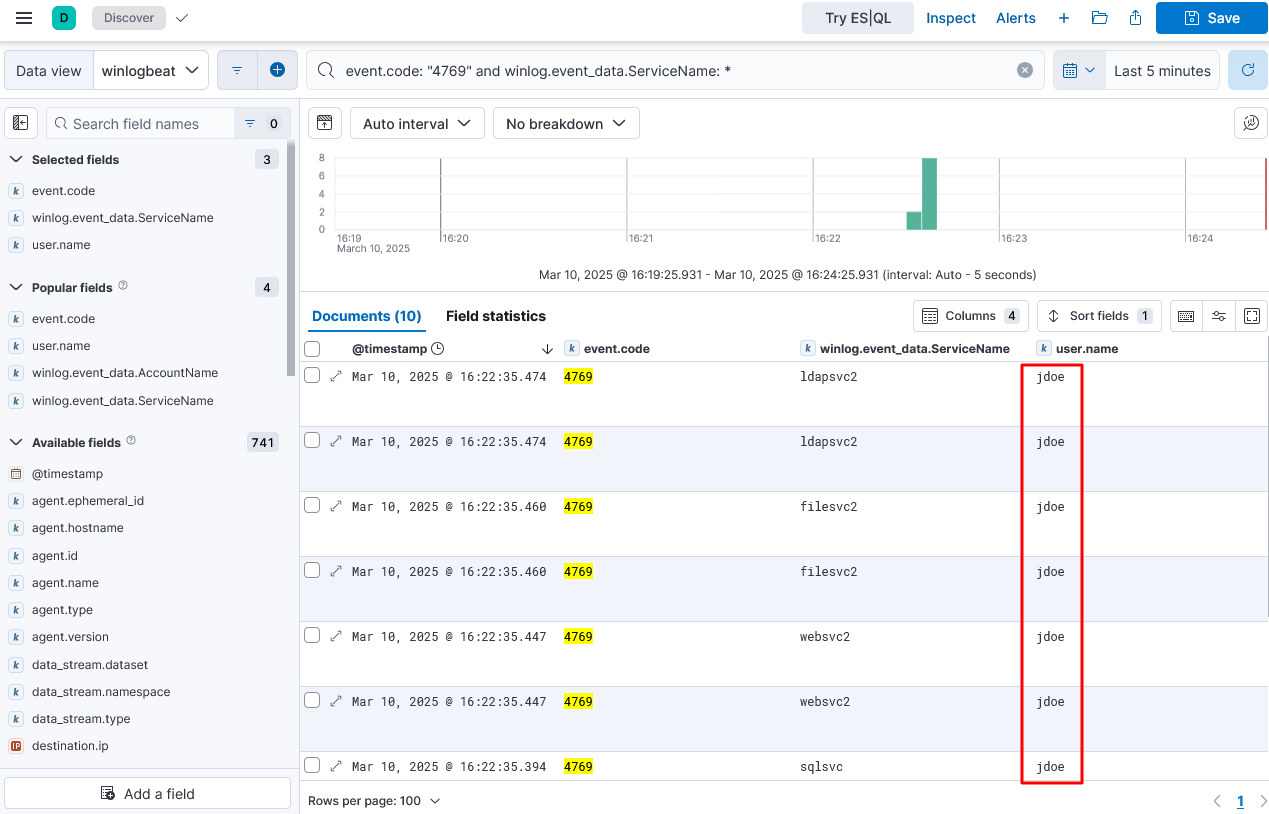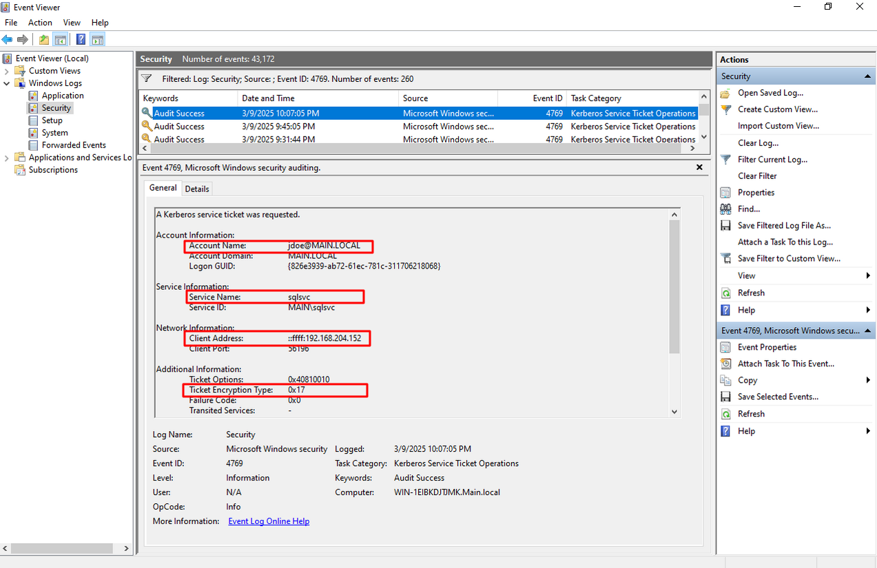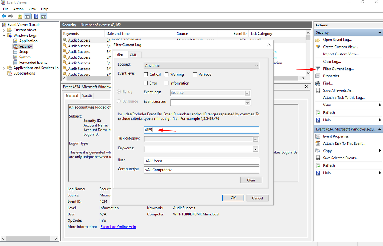 Now, let's filter Event ID 4769 in Event Viewer on the Windows server.