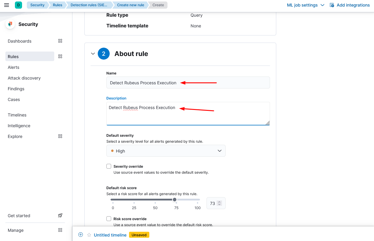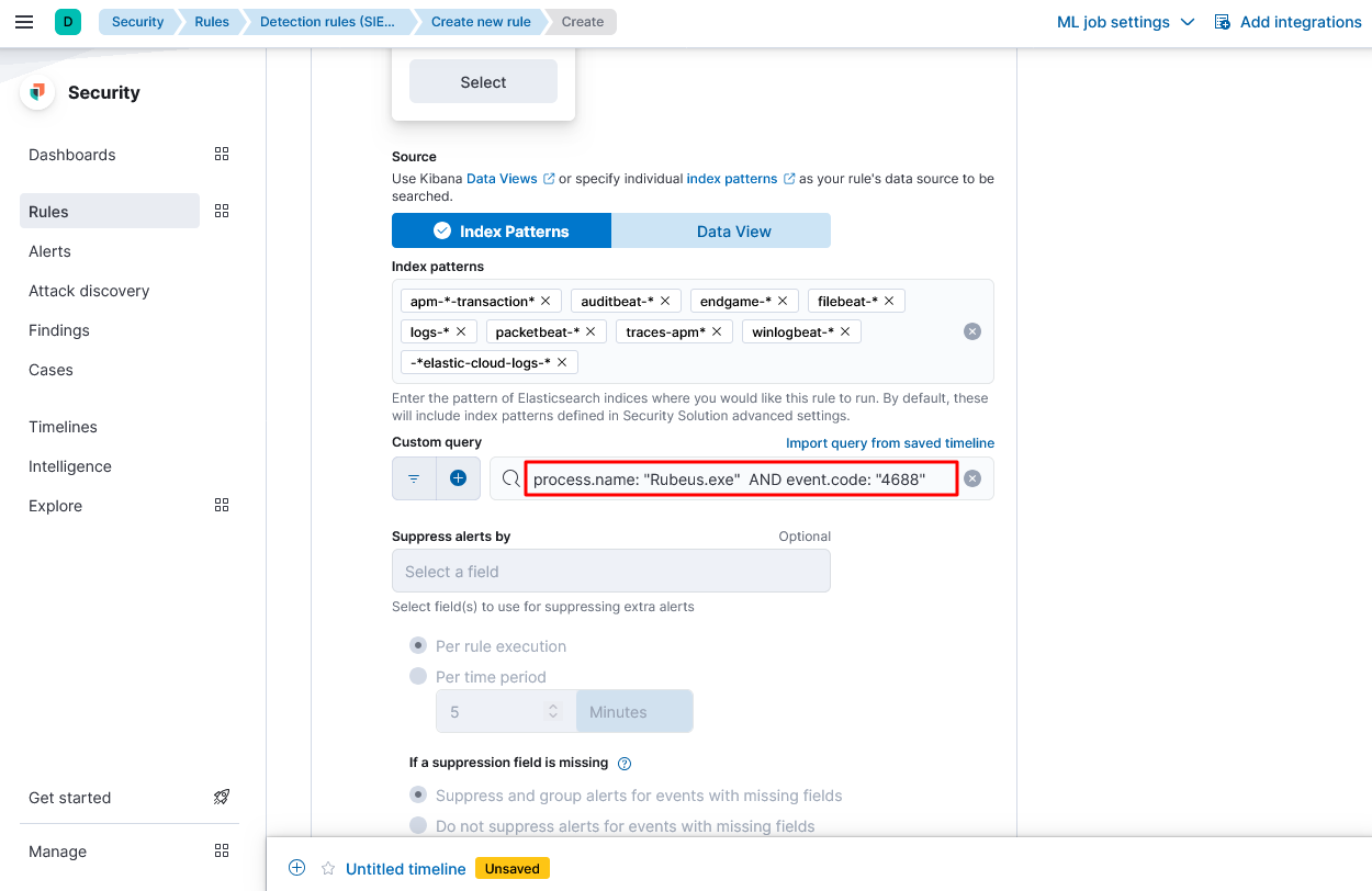 Let's define a rule to generate an alert whenever **Rubeus.exe** is executed.