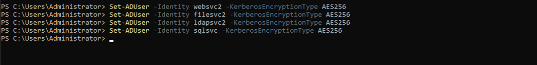 Set-ADUser -Identity filesvc2 -KerberosEncryptionType AES256