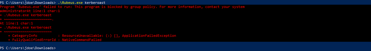 Now, let's attempt to execute **Rubeus.exe** again from the **Downloads** folder.