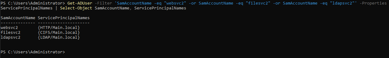 Get-ADUser -Filter 'SamAccountName -eq "websvc2" -or SamAccountName -eq "filesvc2" -or SamAccountName -eq "ldapsvc2"' -Properties ServicePrincipalNames | Select-Object SamAccountName, ServicePrincipalNames