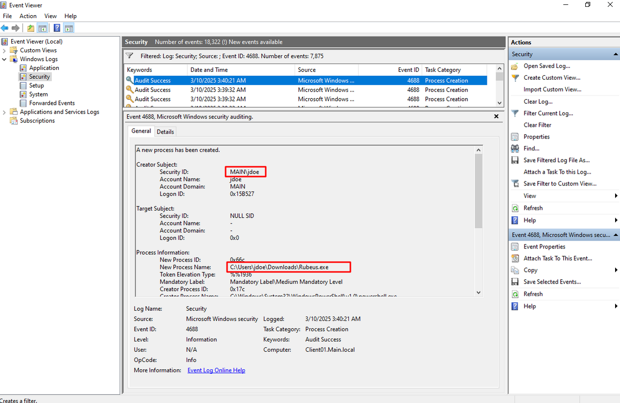 * Audit Process Creation: Success (Event ID 4688, Rubeus execution).