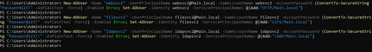 New-ADUser -Name "websvc2" -UserPrincipalName websvc2@Main.local -SamAccountName websvc2 -AccountPassword (ConvertTo-SecureString "Password123!" -AsPlainText -Force) -Enabled $true; Set-ADUser -Identity websvc2 -ServicePrincipalNames @{Add="HTTP/Main.local"}