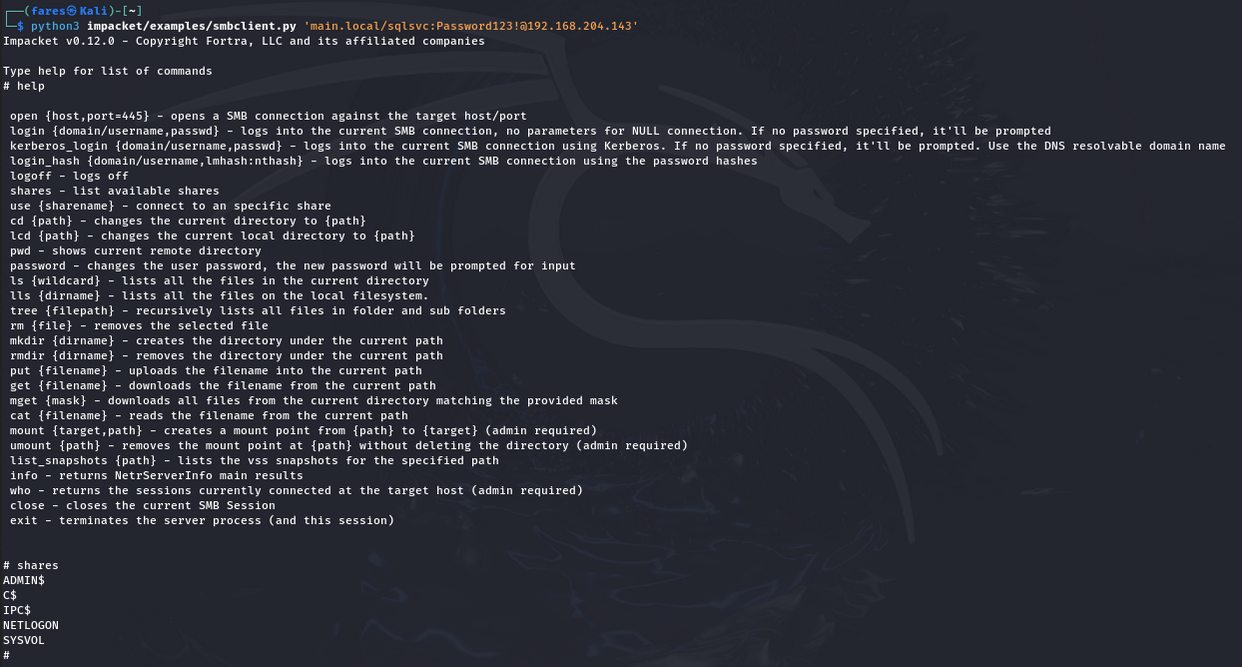python3 impacket/examples/smbclient.py 'main.local/sqlsvc:Password123!@192.168.204.143'
