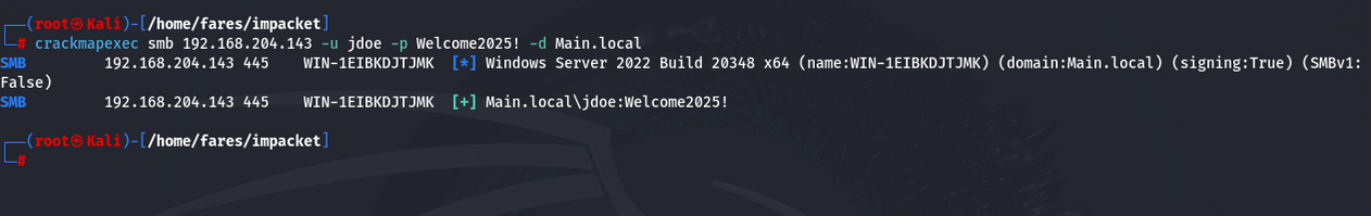 crackmapexec smb 192.168.204.143 -u jdoe -p Welcome2025! -d Main.local