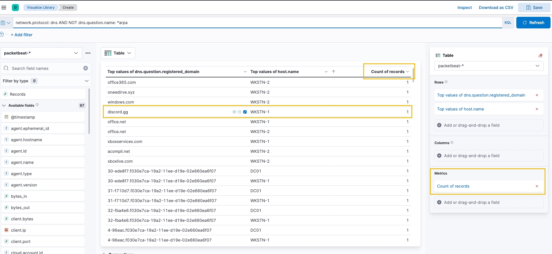 Set the Table Index (packetbeat), Rows (dns.question.registered_domain and host.name), and Metrics (Unique Count of dns.question.subdomain).